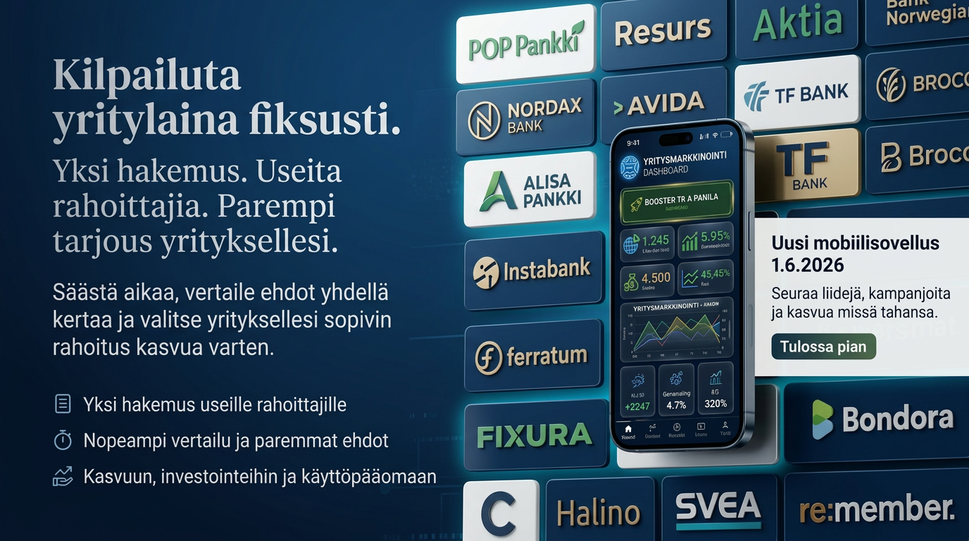 Siirry yrityslainahakemukseen ja vertaile yrityksellesi sopivia rahoitusvaihtoehtoja selkeässä, vakuuttavassa ja ammattimaisessa palveluympäristössä.